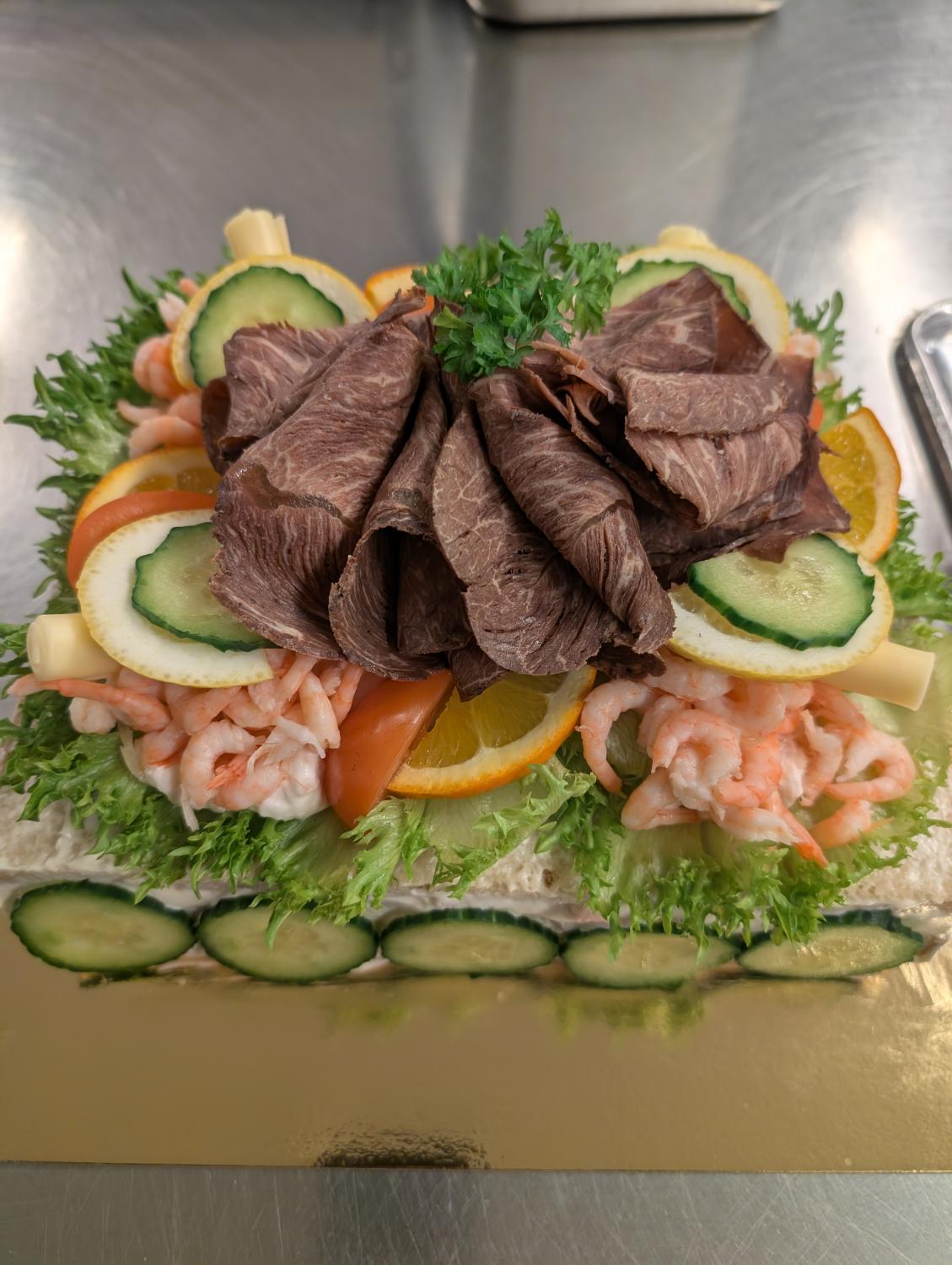 Huvudingrediens: Räkor & Rostbiff. Fyllning: Räksallad, Mimosa. Garnering: Ost, Räksallad, Citron, Apelsin, Tomat, Gurka, Persilja.